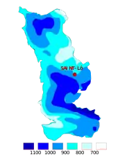 La pluviométrie est importante (entre 120 et 160 jours de précipitations supérieures à 1 mm par an en moyenne[8]), mais varie beaucoup en fonction des terroirs, entre 700 mm sur la côte et 1 300 mm dans le bocage du sud, fréquemment sous forme de crachin.