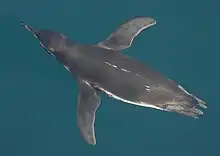 Le manchot des Galápagos mesure en moyenne 48 à 50 centimètres et pèse environ 2 à 4 kilogrammes[3]. C'est la deuxième plus petite espèce de manchot, après le manchot pygmée. Les femelles sont généralement plus petites que les mâles. Les manchots des Galápagos ont une tête noire avec un liseré blanc qui part de derrière l'œil, passe derrière l'oreille et forme un collier au niveau de la gorge. Le sommet du bec est noir et devient rose à la base[4]. Ils ont deux bandes noires sur la poitrine qui se rejoignent sur le dos, la bande inférieure s'étendant sur les flancs jusqu'à la cuisse[5]. Les juvéniles se distinguent par une tête entièrement foncée, plus grise sur le côté et le menton, et n'ont pas de bande sur la poitrine[4].