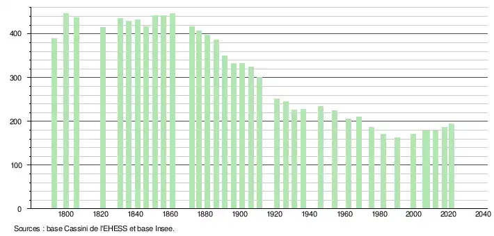 L'évolution du nombre d'habitants est connue à travers les recensements de la population effectués dans la commune depuis 1793. Pour les communes de moins de 10 000 habitants, une enquête de recensement portant sur toute la population est réalisée tous les cinq ans, les populations légales des années intermédiaires étant quant à elles estimées par interpolation ou extrapolation[23]. Pour la commune, le premier recensement exhaustif entrant dans le cadre du nouveau dispositif a été réalisé en 2007[24].