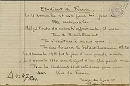 Le , le secrétaire d'État à l'Instruction publique, Georges Ripert, informe les recteurs que le , qui est férié depuis 1922, sera un jour travaillé ordinaire. Il souhaite tout de même des cérémonies discrètes dans les établissements[2]. La lecture d'une circulaire interdisant les manifestations et commémorations est faite par les recteurs d'université et les proviseurs, annonçant indirectement aux jeunes qu'il y avait une tension sur le sujet[6]. L'information fuite jusqu'aux oreilles d'étudiants et lycéens qui n'entendent pas se laisser dicter leur conduite. En effet, la question de la commémoration du , traditionnelle et extrêmement importante depuis 1920, pose problème aux autorités allemandes (qui ne veulent pas d'une célébration de la défaite allemande de 1918) et aux autorités françaises (qui ne veulent ni déplaire au peuple, ni à l'occupant). Le gouvernement de Vichy surenchérit en déclarant que les morts de la Grande Guerre seront finalement commémorés le , jour de la Toussaint[2]. Spontanément, dans un Paris où le sentiment anti-allemand se développe, 20 000 personnes passent déposer à l'Arc de Triomphe près de 500 bouquets le [7].