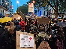 Les manifestations de 2020-2021 en Pologne, connues en Pologne sous le nom de Grève des femmes (polonais : Strajk kobiet), sont des manifestations et des protestations anti-gouvernementales qui se déroulent en Pologne depuis le contre une décision du tribunal constitutionnel, réformé par le parti conservateur Droit et justice (polonais : Prawo i Sprawiedliwość) (PiS)[35]. À l'initiative du parti Droit et Justice, qui domine la coalition électorale Droite unie et la vie politique polonaise, ce tribunal a durci la loi sur l'avortement en Pologne, de manière à rendre illégaux presque tous les cas d'avortement, y compris ceux dans lesquels le fœtus souffre d'un handicap grave et permanent, ou d'une maladie incurable et mortelle[36],[37],[38].