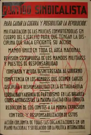 Le Parti Syndicaliste publie son journal, El Pueblo et organise sa propre organisation de jeunesse, les Jeunesses Syndicalistes (Juventudes Sindicalistas). Aux élections de 1936, il participe au Front populaire et obtient deux élus au Parlement, à Cadix et Saragosse, Ángel Pestaña et Benito Pabón. Le parti ne rassemblera jamais plus de 30000 adhérents.