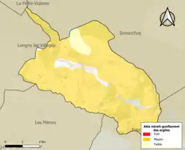 Le retrait-gonflement des sols argileux est susceptible d'engendrer des dommages importants aux bâtiments en cas d’alternance de périodes de sécheresse et de pluie. 90,7 % de la superficie communale est en aléa moyen ou fort (52,8 % au niveau départemental et 48,5 % au niveau national). Sur les 340 bâtiments dénombrés sur la commune en 2019, 316 sont en aléa moyen ou fort, soit 93 %, à comparer aux 70 % au niveau départemental et 54 % au niveau national. Une cartographie de l'exposition du territoire national au retrait gonflement des sols argileux est disponible sur le site du BRGM[16],[Carte 2].