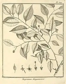 « MAPROUNEA Guianenſis. (Tabula 342.)Frutex octo-pedalis, ramoſus ; ramis & ramulis alternis, flexuoſis. Folia alterna, ovata, acuta, glabra, integerrima, petiolata, decidua, ſupernè viridia, infernè pallide virentia. Flores terminales, in capitulum ſubrotundum congeſti ; inferiores primo expanduntur, deinde casteri ſenſim accreſcunt 5 pedunculus communis elongatur, & in angulos incurvatur, ità ut appareat ſingulum angulum florem unum ſuſtinuiſſe. Quandoque ex angulo prodit pedicellus, capitulum minus floriferum proferens.