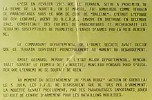 Il a été créé en février 1943 par Émile Guimard, de Lizio, et Antoine Rolland, de Sérent, pour recevoir des parachutages d'armes[5]. Ce terrain discret, dénommé « baleine » derrière la ferme de la Nouette près de Saint-Marcel avait été trouvé à la demande de la mission Cockle composée de deux agents secrets de la France libre, le lieutenant Guy Lenfant et le sergent radio André Rapin, parachutés près de l'étang au Duc entre Ploërmel et Loyat dans la nuit du 21 au pour armer les premiers réseaux de Résistance du Morbihan[6]. Ces deux agents, missions remplies avec de multiples parachutages autour de Ploërmel et de Pontivy durant le premier semestre 1943, retournèrent en Angleterre le de la même année[7], embarquant avec eux le plan des défenses allemandes du Morbihan, remis par le commandant départemental de gendarmerie et résistant, Maurice Guillaudot[8]. En mai, ces parachutages furent suspendus, après quelques ratés, pour ne pas attirer l'attention de l'occupant.