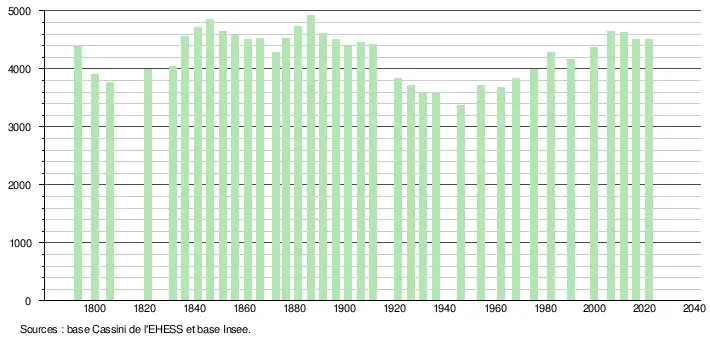 - Population municipale légale en vigueur au 1er janvier 2024, millésimée 2021, définie dans les limites territoriales en vigueur au 1er janvier 2023, date de référence statistique : 1er janvier 2021.