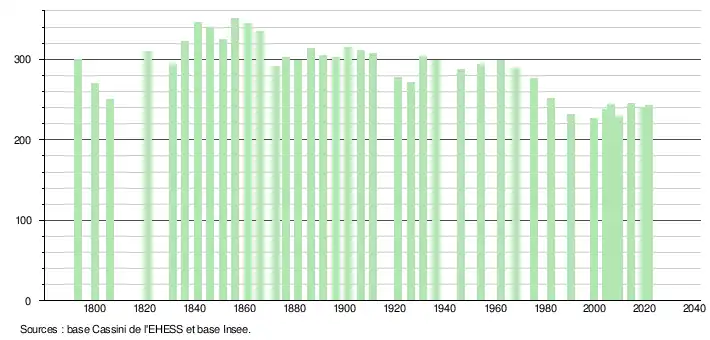 L'évolution du nombre d'habitants est connue à travers les recensements de la population effectués dans la commune depuis 1793. Pour les communes de moins de 10 000 habitants, une enquête de recensement portant sur toute la population est réalisée tous les cinq ans, les populations légales des années intermédiaires étant quant à elles estimées par interpolation ou extrapolation[31]. Pour la commune, le premier recensement exhaustif entrant dans le cadre du nouveau dispositif a été réalisé en 2004[32].