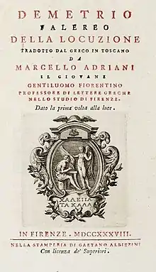 - Une traduction italienne du Traité de l’éloquence de Démétrios de Phalère, qu’il avait laissée manuscrite, et qui n’a été imprimée qu’en 1738, in-8°, par les soins d’Anton Francesco Gori. L’éditeur y a mis une savante préface, pleine de details sur la vie et les écrits de Marcello Adriani.