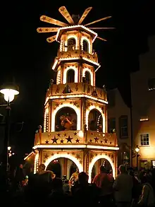 - En Allemagne, on retrouve des marchés de Noël, entre autres à Aix-la-Chapelle, Augsbourg, Bautzen, Berlin-Spandau, Brême, Heidelberg, Brunswick, Chemnitz, Cologne, Dresde, Munich, Münster, Nuremberg et Stuttgart. Outre les sapins, des pyramides de Noël sont installées sur de nombreux marchés de Noël allemands.