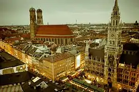 Marché de Noël de la place Marienplatz (place Sainte-Marie) devant l'Hôtel de ville de Munich | |