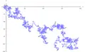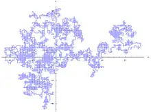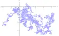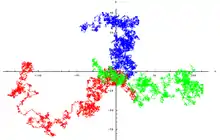 On considère une marche aléatoire sur le réseau plan ℤ2. Il y a ici quatre mouvements possibles à chaque site : en avant, en arrière, à droite, à gauche. La figure ci-contre montre un échantillon de trois simulations numériques indépendantes de marches aléatoires pour une particule : on a tracé les trois trajectoires obtenues.