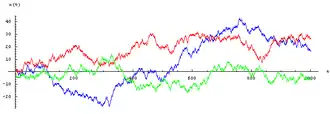 La figure ci-contre montre un échantillon de trois simulations numériques indépendantes de marches aléatoires pour une particule : on a tracé les positions successives x(t) de la particule aux instants t = 1, 2,..., partant de la condition initiale x(0)=0.