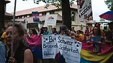 En Suisse, la première marche a lieu à Zurich en 1978, avec comme principale revendication l’égalisation de l’âge du consentement fixé à 16 ans pour les relations sexuelles hétérosexuelles et 20 pour les homosexuelles[40]ainsi que l'arrêt du fichage des hommes homosexuels et bisexuels par la police. Ce fichage continue officieusement par la police cantonale de Berne, jusqu'à ce que l'existence du fichier créé en 1977 soit révélé par le Berner Zeitung le 26 avril 1990[41]. La première marche en Suisse Romande a lieu le 4 juillet 1981 sous le titre de « Homomanif », les mots LGBT, gay et pride n'étant pas utilisés à l'époque. En mai 1982 le groupe Vanille-Fraise organise la Goudou-manif[42]. Une autre marche a lieu à Lucerne en 1983, puis à Zurich en 1989. Les marches des fiertés prennent la dénomination de « pride » que beaucoup plus tard : la marche annuelle organisée à Zurich (Zurich Pride Festival (de)) dès 1994 de façon régulière s'intitule Christopher Day Street jusqu'en 2009[40]. En 1997, des membres de Chez Brigitte ont l'idée de la première Pride romande sous cette dénomination, qui est organisée le 5 juillet 1997[43],[44] (ces personnes lancent également le journal et l'association 360°[45],[46],[47]).