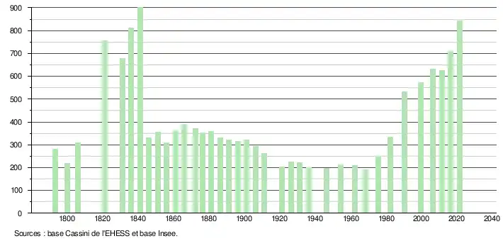 L'évolution du nombre d'habitants est connue à travers les recensements de la population effectués dans la commune depuis 1793. Pour les communes de moins de 10 000 habitants, une enquête de recensement portant sur toute la population est réalisée tous les cinq ans, les populations légales des années intermédiaires étant quant à elles estimées par interpolation ou extrapolation[16]. Pour la commune, le premier recensement exhaustif entrant dans le cadre du nouveau dispositif a été réalisé en 2006[17].