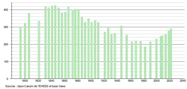 L'évolution du nombre d'habitants est connue à travers les recensements de la population effectués dans la commune depuis 1793. Pour les communes de moins de 10 000 habitants, une enquête de recensement portant sur toute la population est réalisée tous les cinq ans, les populations légales des années intermédiaires étant quant à elles estimées par interpolation ou extrapolation[17]. Pour la commune, le premier recensement exhaustif entrant dans le cadre du nouveau dispositif a été réalisé en 2008[18].
