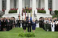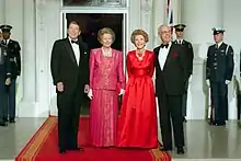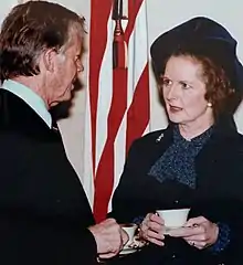 À la tête du parti tory, Margaret Thatcher adopte une attitude anticommuniste, en particulier lors de discours comme celui de Kensington, le , dans lequel elle accuse les Soviétiques d'aspirer à la domination du monde et de sacrifier le bien-être de leur population à cette fin[63]. Cela lui valut le surnom de « dame de fer de l'Occident », donné par le journal du ministère de la Défense soviétique, L'Étoile rouge[64], et popularisé par Radio Moscou ; surnom qui lui plaira et lui restera dès lors attaché. Pour se forger une stature internationale, elle se rend dans trente-trois pays et rencontre de nombreux dirigeants, parmi lesquels Gerald Ford, Jimmy Carter, Valéry Giscard d'Estaing, Anouar el-Sadate, Mohammad Reza Pahlavi, Indira Gandhi, Golda Meir[65]. En 1978, avec la plupart des chefs de partis conservateurs européens, elle participe à la création de l'Union démocrate européenne[66].