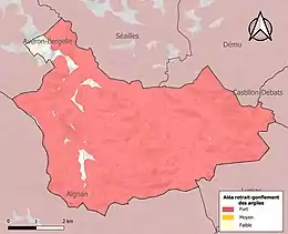 Le retrait-gonflement des sols argileux est susceptible d'engendrer des dommages importants aux bâtiments en cas d’alternance de périodes de sécheresse et de pluie. 96,2 % de la superficie communale est en aléa moyen ou fort (94,5 % au niveau départemental et 48,5 % au niveau national). Sur les 126 bâtiments dénombrés sur la commune en 2019, 122 sont en aléa moyen ou fort, soit 97 %, à comparer aux 93 % au niveau départemental et 54 % au niveau national. Une cartographie de l'exposition du territoire national au retrait gonflement des sols argileux est disponible sur le site du BRGM[26],[Carte 3].