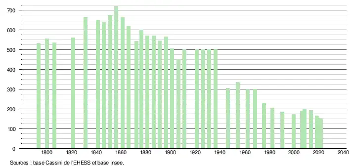 L'évolution du nombre d'habitants est connue à travers les recensements de la population effectués dans la commune depuis 1793. Pour les communes de moins de 10 000 habitants, une enquête de recensement portant sur toute la population est réalisée tous les cinq ans, les populations légales des années intermédiaires étant quant à elles estimées par interpolation ou extrapolation[31]. Pour la commune, le premier recensement exhaustif entrant dans le cadre du nouveau dispositif a été réalisé en 2008[32].