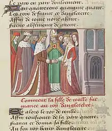 Marguerite d'Anjou. Détail d'une miniature du Livre de Talbot-Shrewsbury par le Maître de Talbot, 1445, British Library[1]. | |