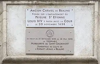 La réforme thérésienne de l'ordre du Carmel a été introduite en France en 1604, à l'instigation du cardinal de Bérulle et de Madame Acarie. Après la fondation du carmel de Paris par six religieuses espagnoles, un monastère est fondé à Pontoise, puis un autre à Dijon dès 1605, lequel essaimera, entre autres, à Beaune, en 1619. Un chanoine y cède le prieuré Saint-Étienne aux carmélites, à condition que celles-ci accueillent plus tard l'une de ses petites nièces en qualité de fondatrice. C'est ainsi que le , Marguerite Parigot est accueillie dans la clôture par la prieure, Mère Élisabeth de la Trinité[1].