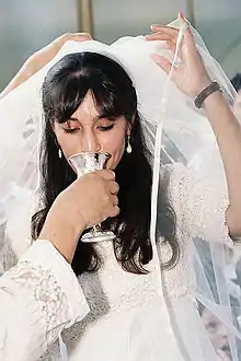 Les époux goûtent alors au vin. C'est après cela que l'homme acquiert sa femme à l'aide d'un anneau en or uniquement, rond et lisse. Il récite à ce moment-là la phrase suivante :