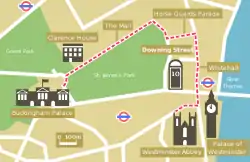 Le palais St. James a annoncé le que la cérémonie commencerait à 11h00, heure locale, et que le marié arriverait à l'abbaye en voiture plutôt qu'en carrosse (ce dernier étant le moyen de transport traditionnel des mariés royaux). Le parcours allait du long du Mall, via Horse Guards Parade, pour descendre à Whitehall jusqu'à l'abbaye.