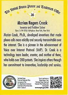 Marian Rogers Croak est vice-présidente de l'ingénierie chez Google. Elle est auparavant vice-présidente principale de la recherche et du développement chez AT&T[1]. Elle détient plus de 200 brevets[2]. Elle a est intronisée au Women in Technology International Hall of Fame en 2013[2]. En 2022, Marian Croak est intronisée au National Inventors Hall of Fame pour son brevet concernant la technologie VoIP (Voice over Internet Protocol)[3]. Elle est l'une des deux premières femmes noires à recevoir cet honneur, avec Patricia Bath[4]. Son invention permet aux utilisateurs de passer des appels via Internet au lieu d'une ligne téléphonique. Aujourd'hui, l'utilisation généralisée de la technologie VoIP est vitale pour le travail à distance et les conférences[3].