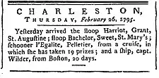 Charleston (USA). C'est en 1794 que l'on trouve le nom de M-É. Peltier, capitaine de l'Égalité, un navire corsaire, basé à Charleston, avec une lettre de marque du général Lavaux en fonction à Saint-Domingue. Il capture 19 prises dont l'Everton, mais cette prise est contestée[8], heureusement il a un contrat avec l'armateur Abraham Sasportas.