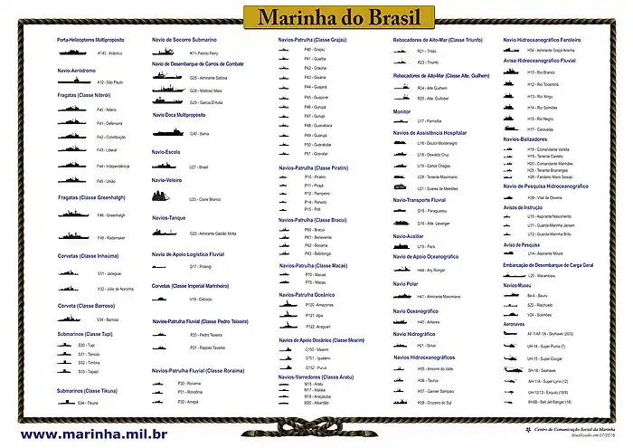 La marine brésilienne met en œuvre en 2007 environ 90 navires de guerre dont un porte-avions (NAe São Paulo), cinq sous-marins, onze frégates, six chasseurs de mines, quatre bâtiments de débarquement et une cinquantaine de patrouilleurs côtiers. Elle dispose également de trois pétroliers ravitailleurs, trois navires-hôpitaux, deux navires océanographiques, un brise-glaces, un bateau-phare.