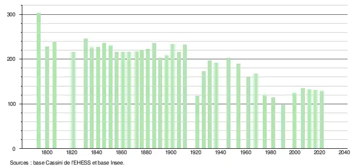 L'évolution du nombre d'habitants est connue à travers les recensements de la population effectués dans la commune depuis 1793. Pour les communes de moins de 10 000 habitants, une enquête de recensement portant sur toute la population est réalisée tous les cinq ans, les populations légales des années intermédiaires étant quant à elles estimées par interpolation ou extrapolation[22]. Pour la commune, le premier recensement exhaustif entrant dans le cadre du nouveau dispositif a été réalisé en 2006[23].