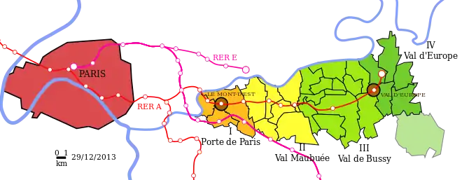 - le secteur IV (Val d'Europe) comprend six communes de Seine-et-Marne : Bailly-Romainvilliers, Chessy, Coupvray, Magny-le-Hongre, Serris et Villeneuve-le-Comte ; cette dernière ayant été ajoutée au périmètre d'aménagement d'Epafrance en 2011[2].