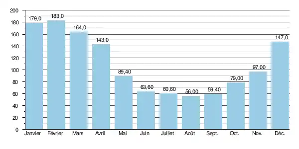 Les hautes eaux hivernales atteignent des moyennes mensuelles de 103 à 130 m3/s, de décembre à mars inclus, avec un maximum en janvier-février. Les basses eaux d'été, qui vont de juin à septembre atteignent leur minimum moyen en août avec 34,3 m3/s[15].