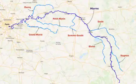 La Marne est une rivière française située à l'est du bassin parisien et longue de 514,26 km[1]. Elle représente à ce titre la plus grande rivière de France[3]. C'est le principal affluent de la Seine : elle prend sa source sur le plateau de Langres, à Balesmes-sur-Marne, sur la commune de Saints-Geosmes (Haute-Marne) et se jette dans la Seine entre Charenton-le-Pont et Alfortville (Val-de-Marne) dans le quartier de Conflans-l'Archevêque. Son nom est intégré à celui de quatre départements français.