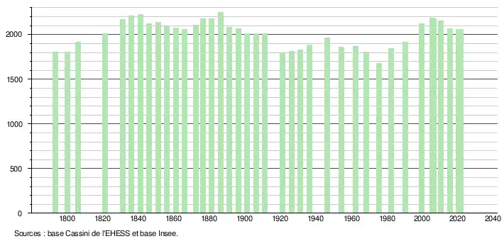 L'évolution du nombre d'habitants est connue à travers les recensements de la population effectués dans la commune depuis 1793. Pour les communes de moins de 10 000 habitants, une enquête de recensement portant sur toute la population est réalisée tous les cinq ans, les populations légales des années intermédiaires étant quant à elles estimées par interpolation ou extrapolation[23]. Pour la commune, le premier recensement exhaustif entrant dans le cadre du nouveau dispositif a été réalisé en 2005[24].