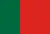 Ancienne Cocarde en drapeau: rouge avec un soleil jaune à 16 rayons légèrement décalé 1 sur 2.