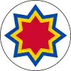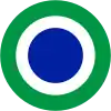 Cocarde en 3 cercles: centre bleu avec un soleil jaune à 12 branches et un anneau bleu au central, milieu rouge (moins large), extérieur vert.