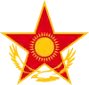 Image 1: Cocarde: noire avec un triangle rouge, au centre une houe jaune, tête vers la gauche, et un AK-47 jaune, canon vers la droite, croisés sur le relief jaune d'un livre ouvert, une petite étoile jaune sous la baïonnette. Image 2: Idem Image 1 sauf que le triangle a le sommet vers le bas.