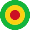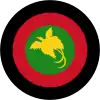 Cocarde en 3 cercles: extérieur noir, milieu rouge, centre vert avec un oiseau paradisier jaune.