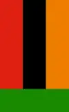 En drapeau divisé en 3 parties verticales: gauche noir, milieu rouge droite orange, une bande horizontale vert sur tout le bas.