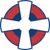 Cocarde en écu: Écu de gueules (rouge) à la double croix d'argent (croix de Lorraine blanche) sur le pic central d'un groupe de trois collines d'azur (bleu). L'écu est parfois bordé blanc. | |