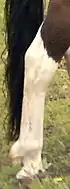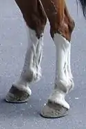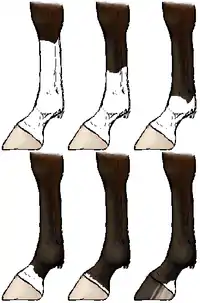Les membres peuvent eux aussi présenter différentes marques blanches. Suivant leur taille et leur forme, elles portent un nom différent. Les plus fréquentes sont nommées « balzanes »[8]. Si elles se prolongent vers le sabot, la corne de celui-ci est fréquemment blonde au lieu d'être brune[9].