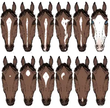 | demi-belle face[4] | déborde sur la moitié droite ou gauche du chanfrein |