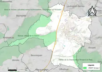 - la vallée de la Slack entre Rinxent et Rety, d’une superficie de 541 hectares et d'une altitude variant de 12 à 45 mètres. Cette ZNIEFF correspond à un complexe de prairies pâturées, de cultures intensives et de quelques bois[21].