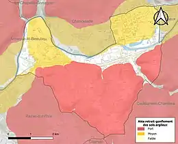 Les mouvements de terrains susceptibles de se produire sur la commune sont des tassements différentiels[46]. Le retrait-gonflement des sols argileux est susceptible d'engendrer des dommages importants aux bâtiments en cas d’alternance de périodes de sécheresse et de pluie[47]. 82,3 % de la superficie communale est en aléa moyen ou fort (58,6 % au niveau départemental et 48,5 % au niveau national métropolitain)[Carte 4]. Depuis le , en application de la loi ÉLAN, différentes contraintes s'imposent aux vendeurs, maîtres d'ouvrages ou constructeurs de biens situés dans une zone classée en aléa moyen ou fort[Note 6],[48].