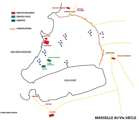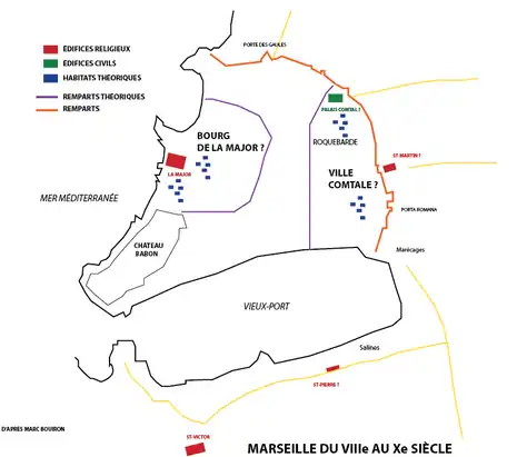 Nous savons que Marseille, à la fin du VIIe siècle, est particulièrement enfermée dans une enceinte réduite, le castrum Babonis de l'évêque, fortification qui a sans doute beaucoup servi lors des invasions successives du IXe siècle. Face à lui a été érigé un autre castrum (château), occupé par le pouvoir civil. Entre ces deux bâtiments se trouve un espace formé de l'ancienne zone du forum, qui va se dépeupler au IXe siècle à cause des ravages qu'ont entraînés les invasions[19].