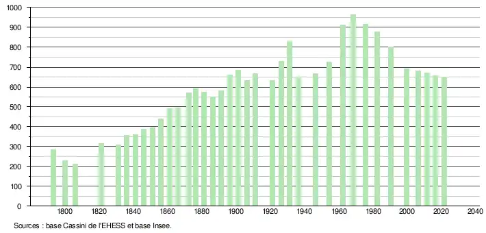 L'évolution du nombre d'habitants est connue à travers les recensements de la population effectués dans la commune depuis 1793. Pour les communes de moins de 10 000 habitants, une enquête de recensement portant sur toute la population est réalisée tous les cinq ans, les populations légales des années intermédiaires étant quant à elles estimées par interpolation ou extrapolation[27]. Pour la commune, le premier recensement exhaustif entrant dans le cadre du nouveau dispositif a été réalisé en 2006[28].