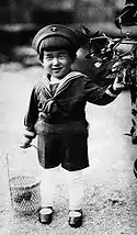 Né au Kōkyo, ou palais impérial de Tokyo, le , il reçoit le septième jour après sa naissance, soit le , le nom personnel (ou prénom) de 正仁 (Masahito), unissant les kanji 正 (masa-, tada-, sei, shō), qui implique le champ lexical de la justice, de l'exactitude[1], et 仁 (-hito, jin, ni) qui lui renvoie à la vertu, à la bienveillance, à la piété et au lien entre l'humanité et le ciel[2], et servant de suffixe à pratiquement tous les noms personnels des fils de la famille impériale depuis le XIe siècle. Son prénom peut ainsi être traduit littéralement par « Juste vertu ». Il reçoit également à sa naissance le titre de prince de Yoshi (義宮, Yoshi-no-miya), le kanji 義 (yoshi, gi) se rapportant une nouvelle fois au thème de la justesse, de la moralité ainsi que du respect des règles[3].