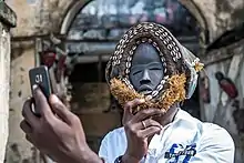 Le porteur du masque Goli est un initié plongé dans un sommeil hypnotique. Son costume se compose d'une grande cape, d'une jupe en fibres de raphia, de grelots aux pieds et il porte une peau de panthère sur le dos.