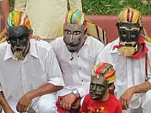 Les masques vont du brut aux plus détaillés pour donner l’impression de vrais visages[45]. La plupart des masques sont ajustés au visage humain, les danseurs observant à travers des fentes juste au-dessus des yeux peints[9]. Les plus petits masques mesurent entre dix et quinze centimètres de large, le reste du visage, bouche comprise, est recouvert d'un tissu[46]. D'autres masques sont beaucoup plus grands que le visage, le porteur regardant par la bouche du masque[9],[47]. Certains masques ont des parties mobiles telles que les lèvres, la langue et les paupières pour les rendre plus animés[9],[48].