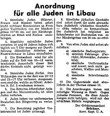 Les 29 et 30 juin 1941, des soldats allemands tirent au hasard sur des Juifs à Liepāja. Environ 99 Juifs (plus ou moins 30) sont tués dans ces fusillades[10]. Puis les fusillades commencent presque immédiatement en rassemblant des habitants juifs, en raflant les médecins et patients juifs de l'hôpital[10]...